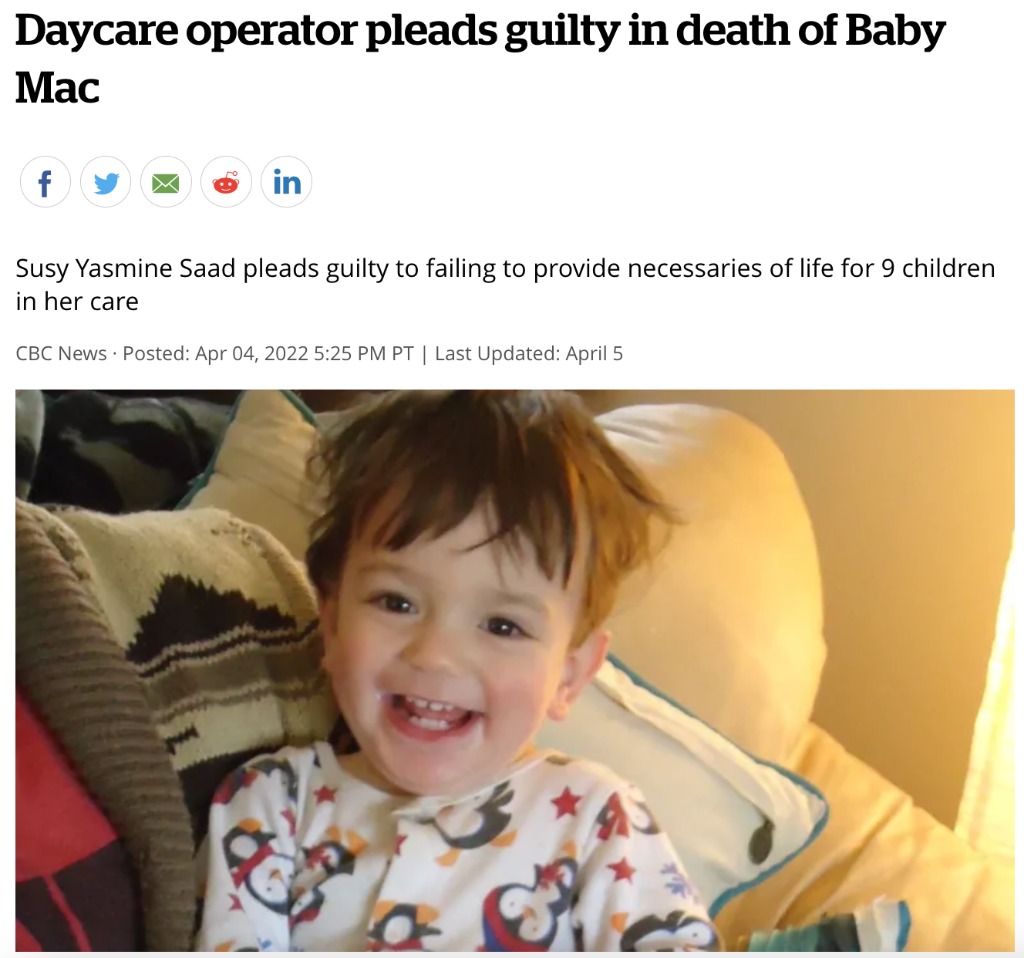 2017 年 1 月 18 日,Baby Mac 于 2017 年 1 月 18 日在东温哥华的 Saad 未经许可和未注册的日托中心去世时,他只有 16 个月大。
