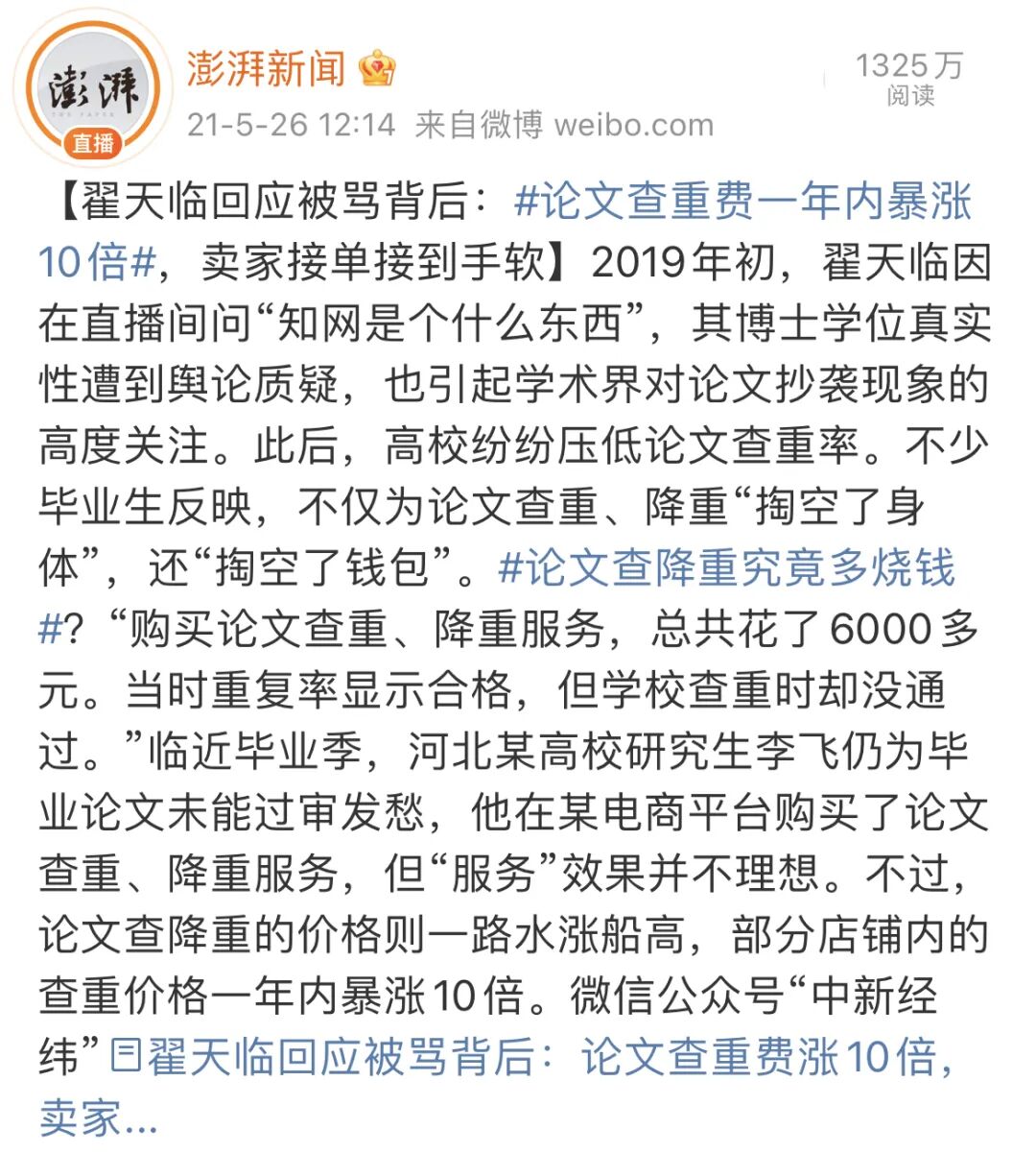 去年澎湃新聞就曾報道,論文查重費用壹年內暴漲了拾倍。