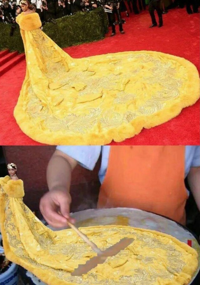 蕾哈娜穿了中國設計師郭培打造了壹件禮服,被網友吐槽穿成了壹個煎餅果子。