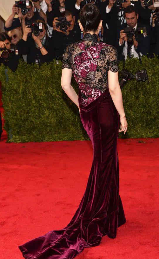 合照外的鞏俐穿了意大利設計師品牌 Roberto Cavail 的中式旗袍,酒紅色絲絨加上黑色鏤空蕾絲襯托出她的大氣,後背的設計還是很美的。