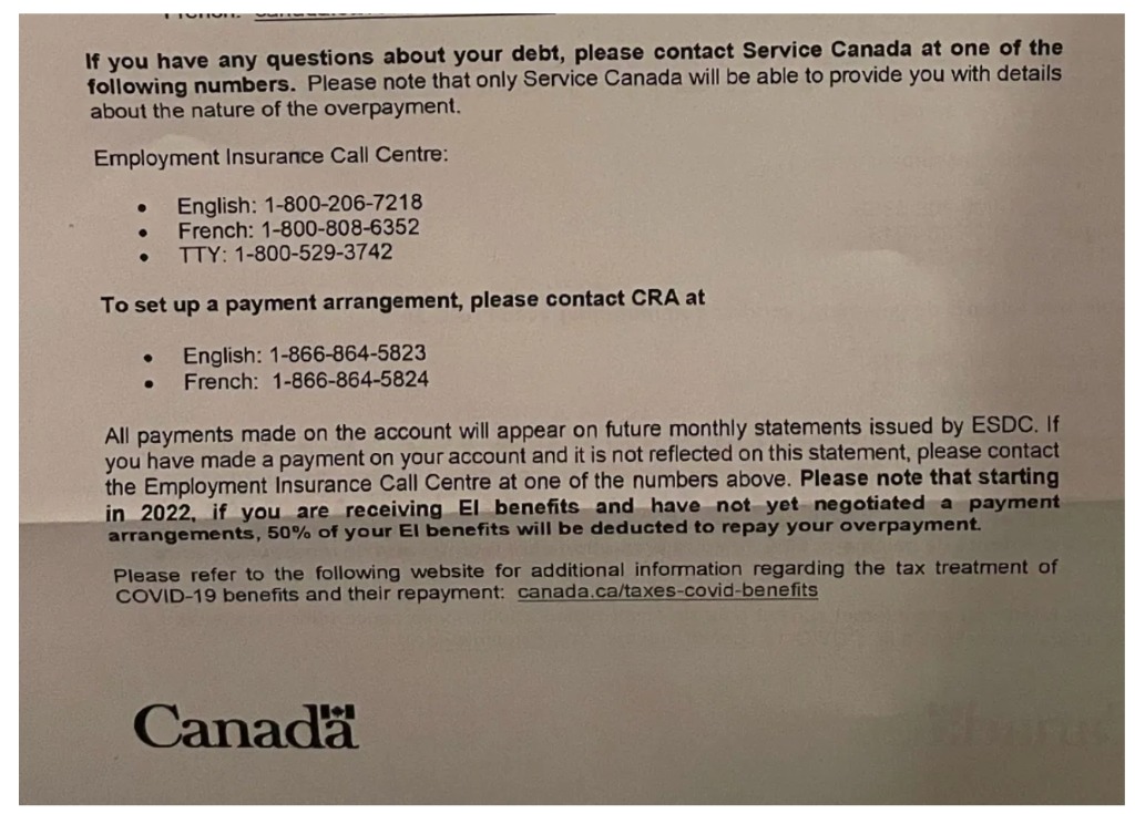 2021 年 11 月,聯邦就業部長 Carla Qualtrough 發表聲明說,疫情初期為了讓大家盡快得到財政支持,只要申請CERB的人都得到了預付款。但並不是所有人都符合資格,加拿大服務中心(Service Canada)正在審查那些不符合資格的人,並要求這群人償還債務。