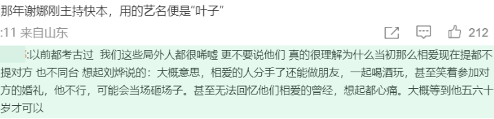 評論轉發也提到了他們當年很多戀愛細節,譬如謝娜剛去《快本》主持的藝名就是“葉子”,劉燁說過有的相愛的人分手了還能做朋友,壹起喝酒壹起玩,可他不行,想起就心痛。