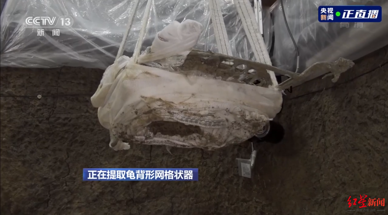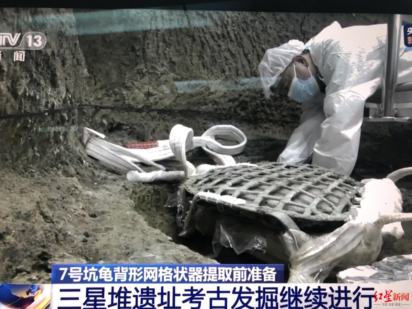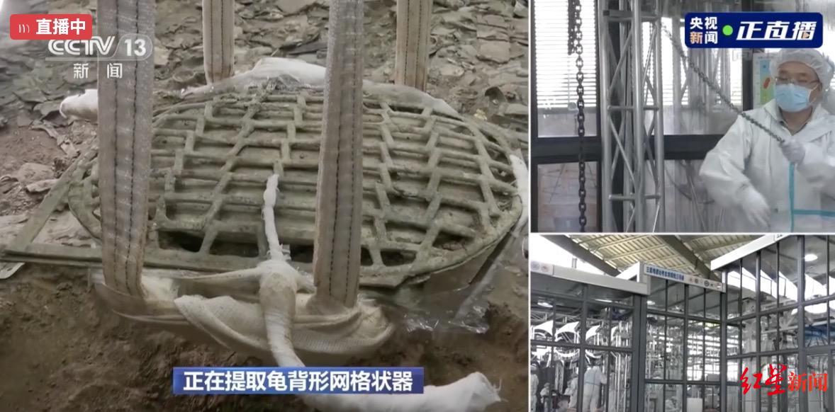 7號坑內的龜背形網格狀器,按照之前專家介紹的方案:在它底座周圍把土掏空,用“繃帶”加固了部分網格,並將其延長形成帶子,掛到7號坑上方的滑輪架上——就這樣緩緩地吊起了網格狀器。可以看到它下方還有附帶著的大塊泥土,待轉運至文保中心後再慢慢清理。