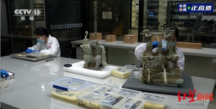 6月14日下午,在叁星堆考古發掘的現場直播中,7號和8號坑此前最受矚目的兩件文物都得到了充分亮相。其中,7號坑內的龜背形網格狀器在鏡頭下被整體抬出了坑;8號坑內的神壇則已於日前平安出坑,今天下午是在叁星堆博物館內的文物保護修復中心與觀眾們見面。另外,8號坑中的倒立頂尊神人像也在下午被提取出坑。