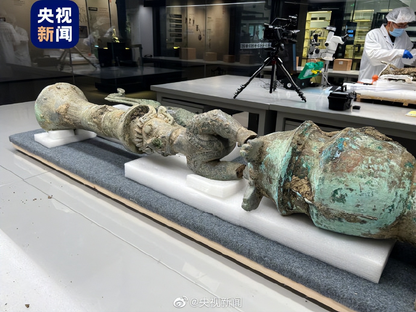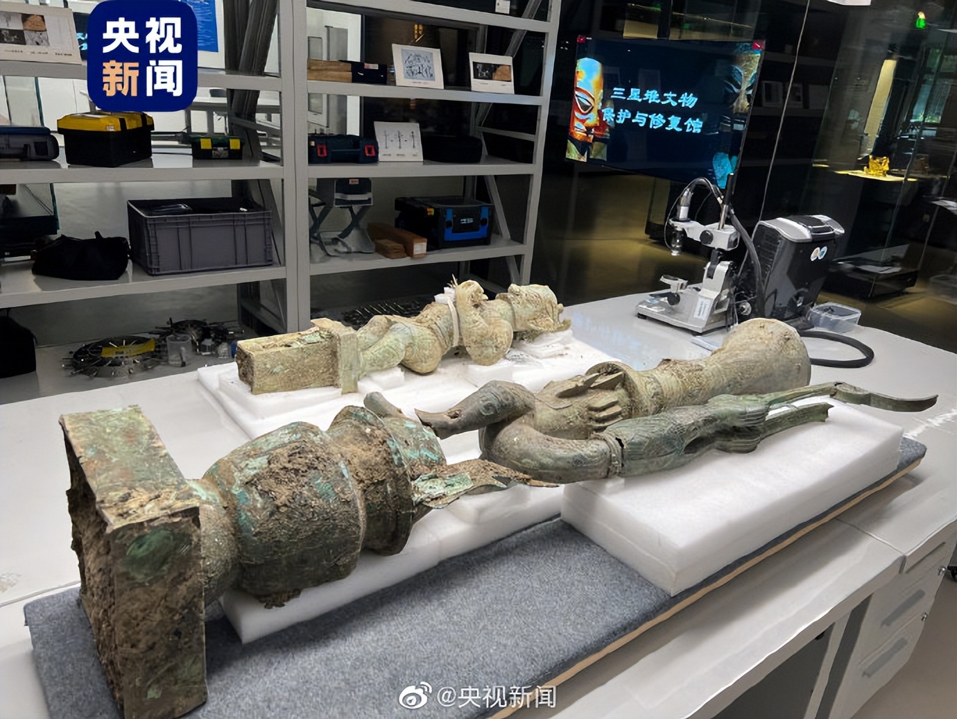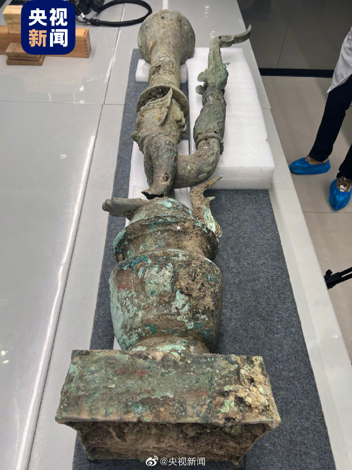 今天,叁星堆新出土的頂尊屈身倒立人像,與1986年出土的鳥腳人像實現拼合。合體後的器物通高超1.5米,雙手撐罍倒立人,身體向後卷曲向上,腳呈鳥爪狀;頭頂高挑觚形尊!