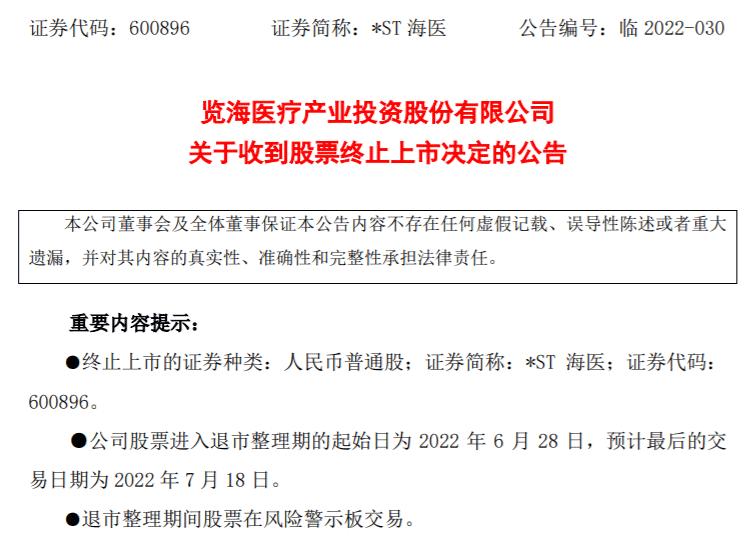 6月20日晚間,*ST海醫(原股票簡稱覽海醫療,SH600896,股價1.74元,市值18億元)公告稱,公司於同日收到上海證券交易所《關於覽海醫療產業投資股份有限公司股票終止上市的決定》,上交所決定終止公司股票上市。按照相關規定,*ST海醫股票將於6月28日進入退市整理期交易,證券簡稱將由“*ST海醫”變更為“退市海醫”,退市整理期為15個交易日,預計最後交易日為7月18日。