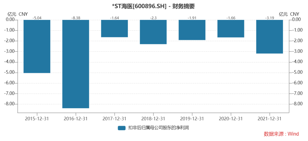 Wind數據顯示,2015年以來,*ST海醫扣非後歸母淨利潤均為負值,數次游走在退市邊緣。