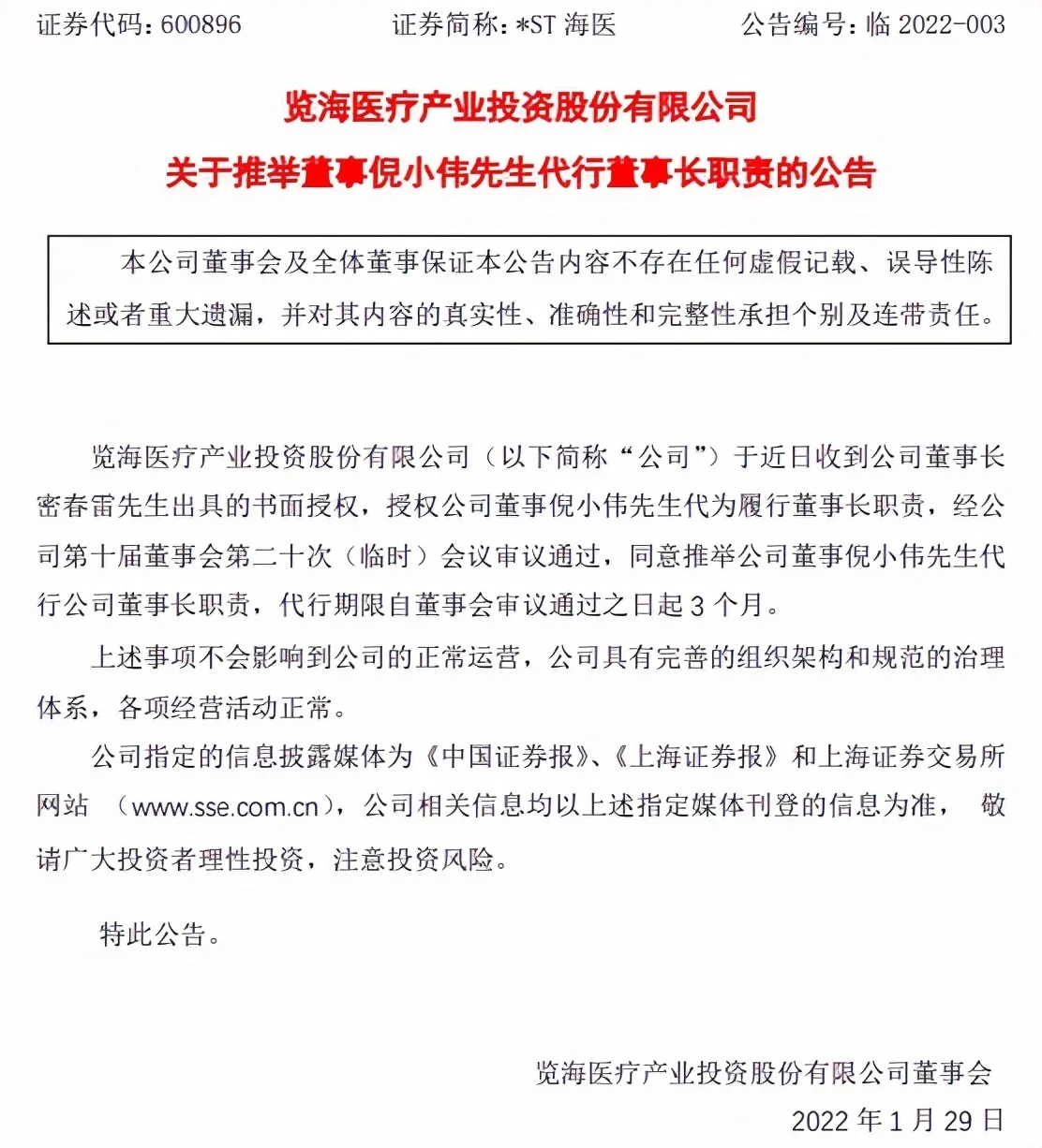 2022年1月29日,覽海醫療發布壹則公告稱,近日收到董事長密春雷的授權書,授權公司董事倪小偉代為履行董事長職責,代行期限3個月。