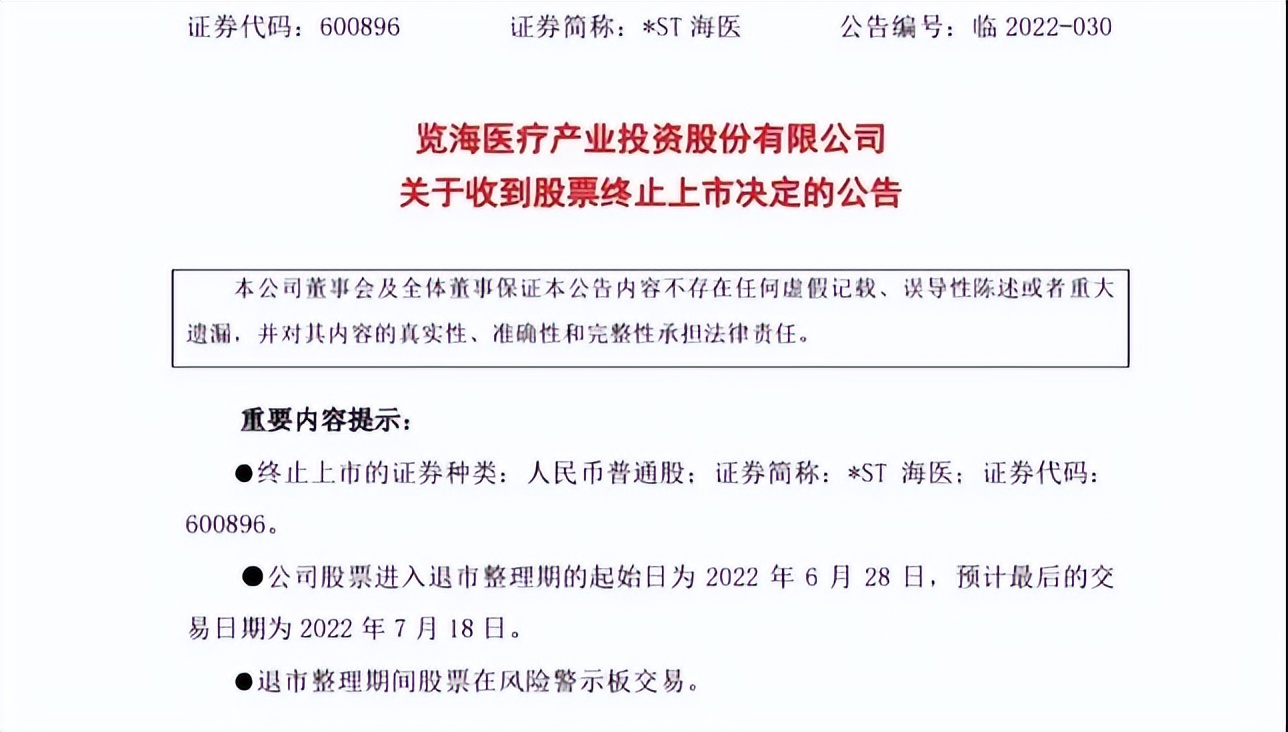 6月20日,退市海醫披露稱,公司收到股票終止上市決定,上交所決定終止公司股票上市。並於之後的6月28日進入了退市整理期,證券簡稱將由“*ST海醫”變更為“退市海醫”,預計最後交易日期為7月18日。