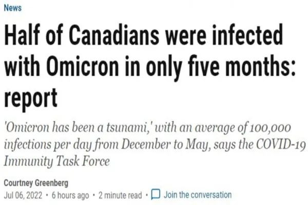 當日,《金融郵報》這樣報道:“在過去僅僅5個月中,就有半數加拿大人(約1700萬人)感染過Omicron!Omicron海嘯般無法阻擋,每天感染10萬人!報道援引數據顯示,在Omicron抵達加拿大之前,有7%的加拿大人有抗體。從2021年12月到2022年5月,這壹比例激增到了45%。目前,Omicron變種病毒的新亞系壹直在傳播,染疫的加拿大人的比例遠高於50%……研究發現,所有省份的所有年齡段的加拿大人都受到了這種病毒的影響。