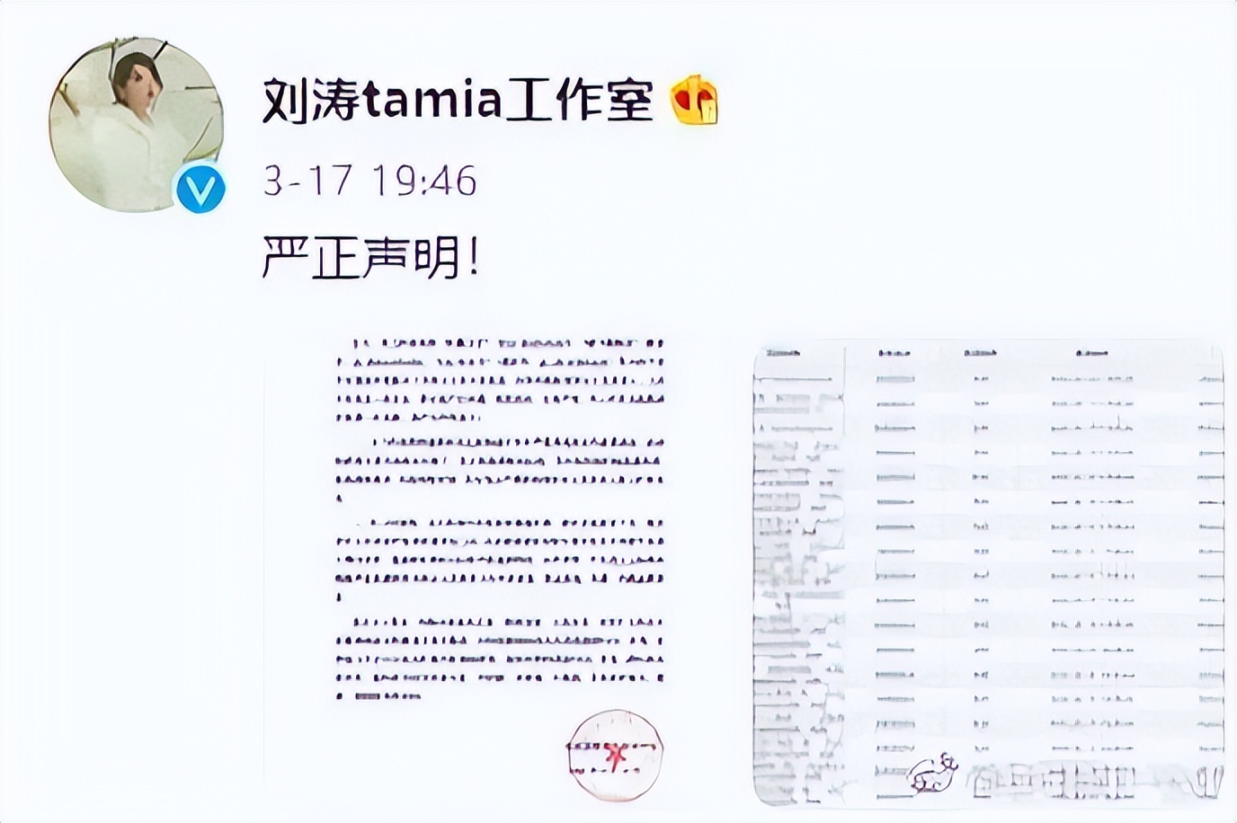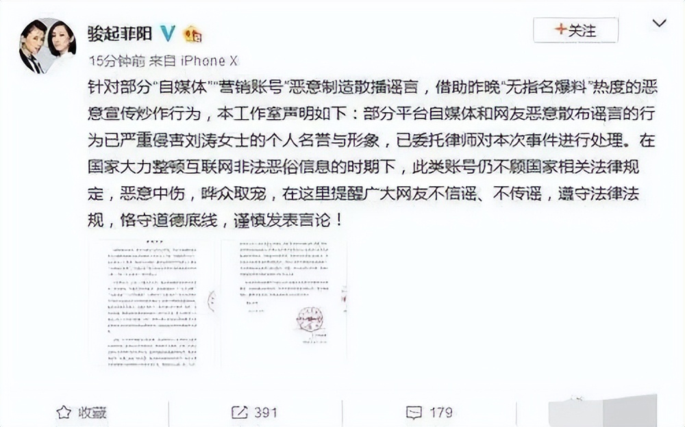 重重輿論聲討下,劉濤工作室就有網友惡意散布“劉濤睡小鮮肉”、“劉濤出軌”等謠言發出聲明,嚴厲斥責該行為,並表示已提交律師處理。
