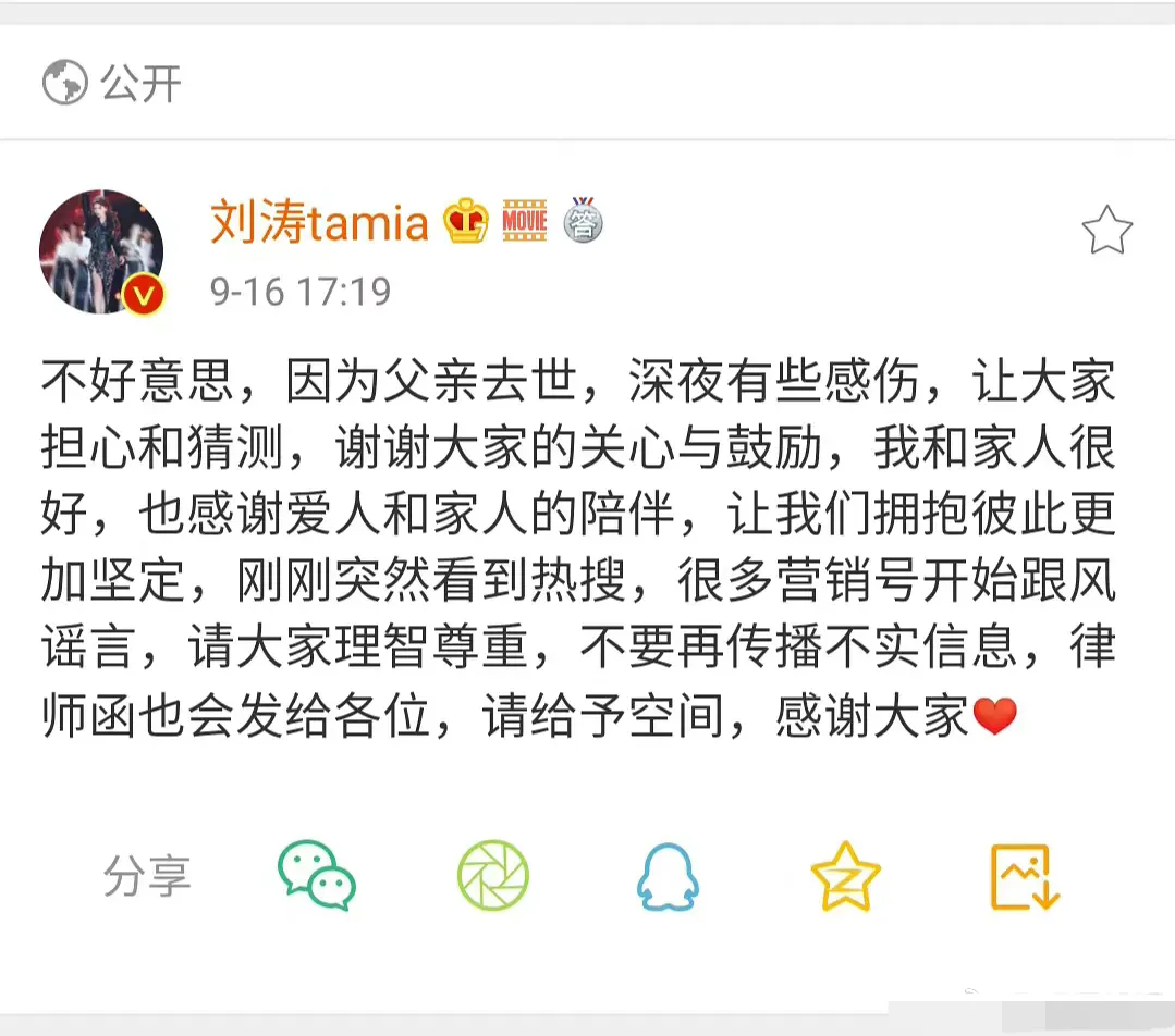 劉濤針對此事還專門寫了壹篇長文,表示這些年來無數謠言壹直影響到家人和自己的正常生活,言語間盡是無奈。