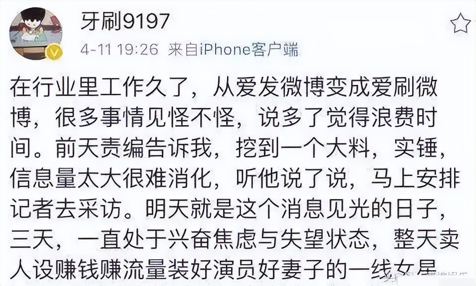 4月11日晚,有網友(後改成媒體人)發文“在行業裡工作久了,從愛發微博變成愛刷微博,很多事情見怪不怪,說多了覺得浪費時間。