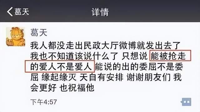 據說倆人離婚的時候,葛天還發朋友圈 diss 這段感情,表示 " 能被搶走的愛人不是愛人 "。