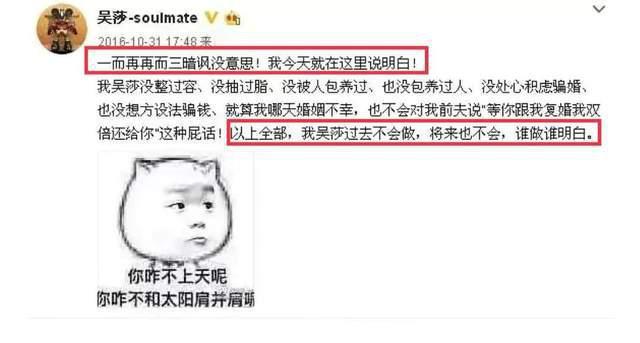 幾天後,吳莎發文回懟那些內涵自己的人,稱自己沒整過容、抽過脂、沒被人包養過、也沒包養過人、沒處心積慮騙婚、也沒想方設法騙錢," 就算我哪天婚姻不幸,也不會對我前夫說 " 等你跟我復婚,我雙倍還你 " 這種屁話!"