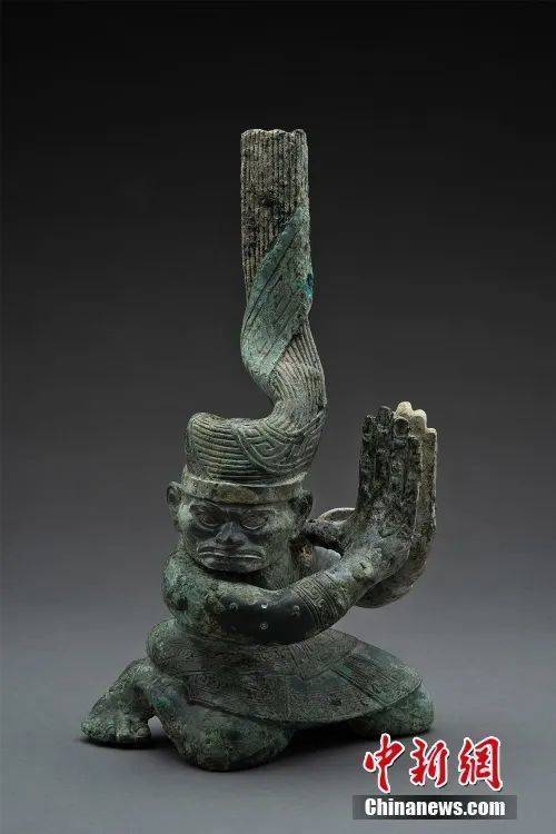 圖為4號祭祀坑出土的扭頭跪坐人像。中新社發 國家文物局 供圖