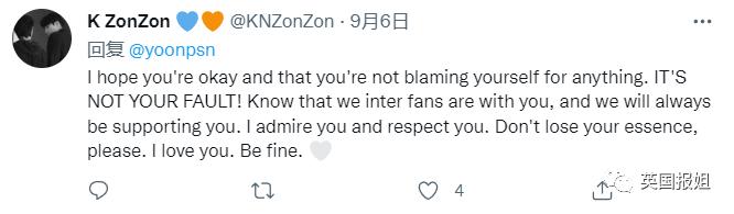 " 希望你沒事,不去要責怪自己,這不是你的錯!來自全世界的粉絲都會和你在壹起,我們會永遠支持你。"