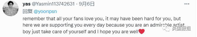 " 記住粉絲們是愛你的!這種事情對你來說肯定特別糟糕,但我們會每天支持你,照顧好自己!"