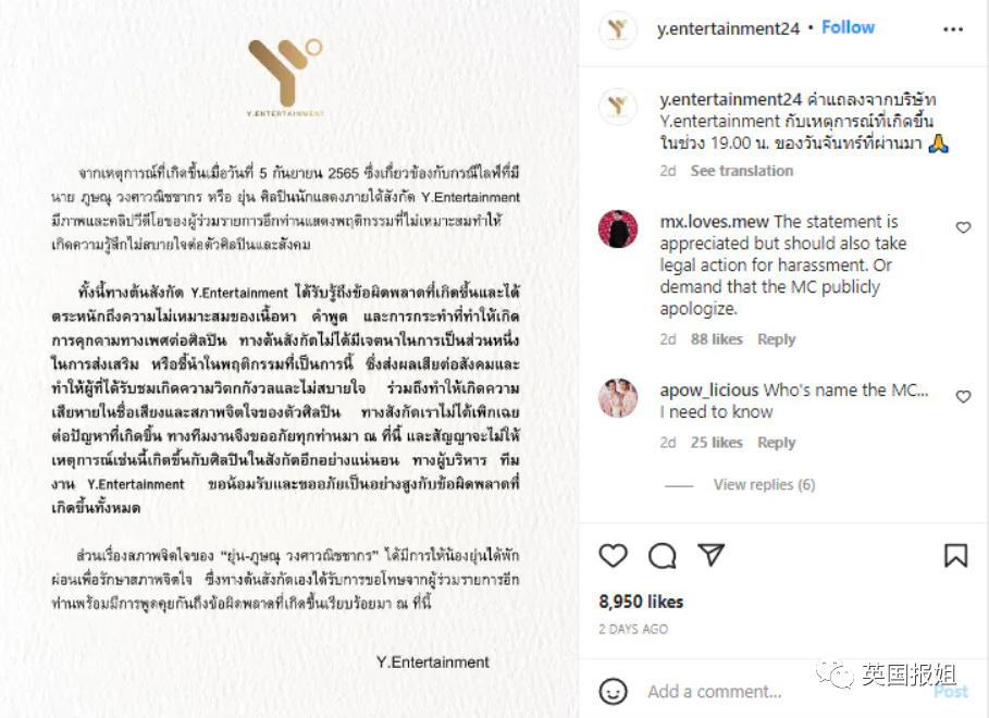 Yoon 的經紀公司在之後發布了相關聲明,他們為觀眾經歷的不適表示歉意,並表示不會容忍此類行為的發生: