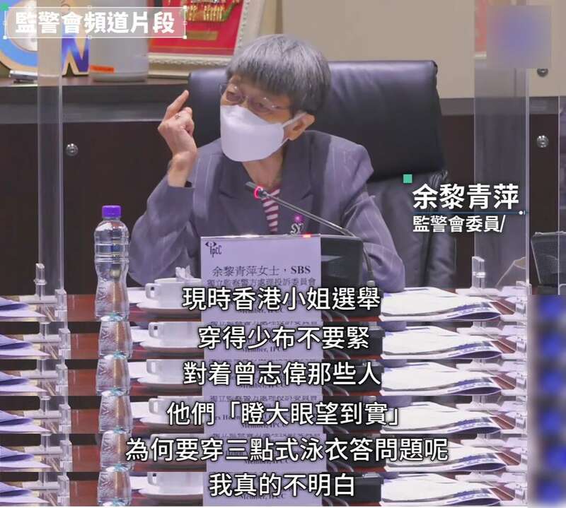 監警會委員余黎青萍女士在20日的會議中指出,現在電視節目及電影色情暴力元素泛濫,令市民吸收大量色情暴力元素、導致虐兒案件暴增,將矛頭指向TVB港姐競選的“泳裝環節”,指壹個個身上的布少到不得了,不明白為什麼要穿泳裝上陣,被TVB總經理曾志偉那伙人“瞪著眼睛看個遍”,