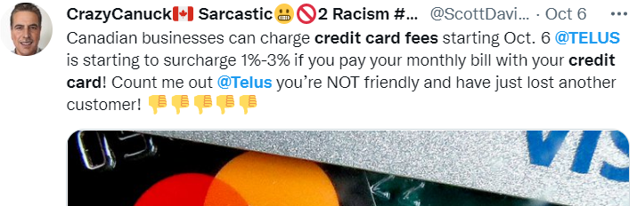 用戶說:如果您使用信用卡支付每月賬單,則開始收取附加費了! @Telus不友好,算我壹個,剛剛你失去了又壹個客戶!
