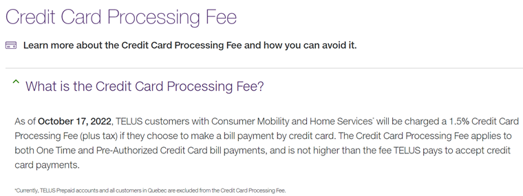 Telus也在其網站上明確表示將對魁北克以外的所有客戶征收1.5%的信用卡處理費。