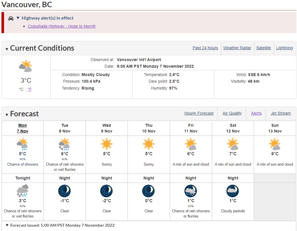 加拿大环境部已对高贵哈拉高速公路(Coquihalla Highway)霍普(Hope)至梅里特(Merritt)路段,以及霍普(Hope)至普林斯顿(Princeton)通过艾利森山口(Allison Pass)的3号和5号高速公路发出降雪警告。