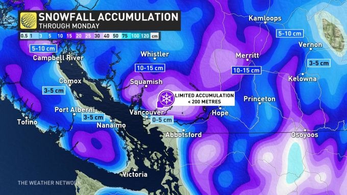 BC低陆平原位置偏南,不会直接受到北极寒流的影响,但气温也足够低,以至于在本拿比和素里周围的高海拔地区都出现飘雪。