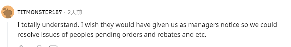 我希望他們能提前給經理們壹個通知,這樣我們就能處理顧客們的訂單,以及購物卡的返現問題。