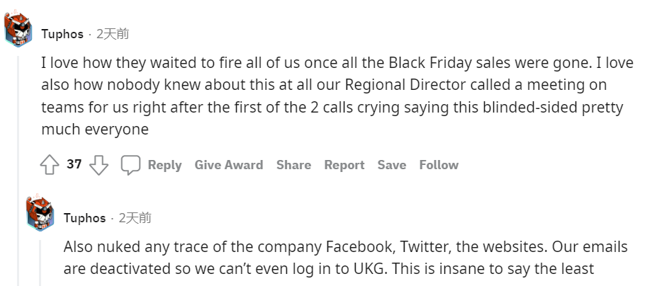 他們在黑色星期伍的所有促銷活動結束後解雇我們所有人,沒有人知道這件事,此外,公司還刪除了Facebook、Twitter和網站。