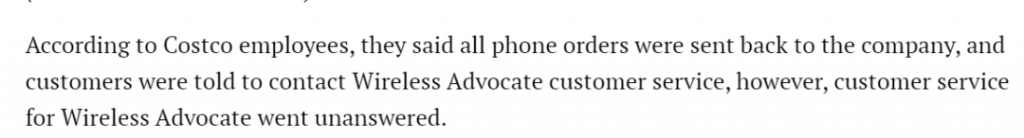 Costco的雇員說,幾乎所有的手機訂單都發回公司,顧客被告知要自己聯系Wireless Advocates的客服,然而可笑的是,WirelessAdvocates的客服電話沒人接聽。