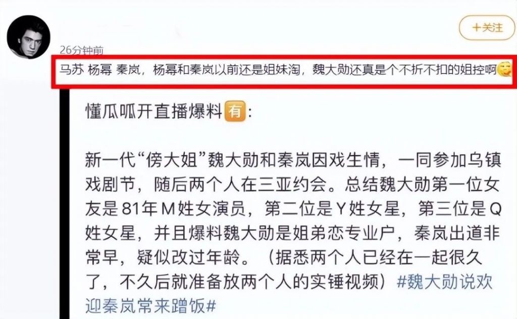 在戀情曝光後,魏大勳自然成為了網友討論的對象。首先回顧壹下魏大勳的感情史,狗仔在爆料這段戀情的同時,稱魏大勳壹共有叁段戀情,第壹段是與81年M姓女星、第贰段是Y姓女星、第叁段就是秦嵐,雖然沒有明說前兩位是誰,有網友壹下就猜出來,這贰位分別是馬蘇和楊冪。