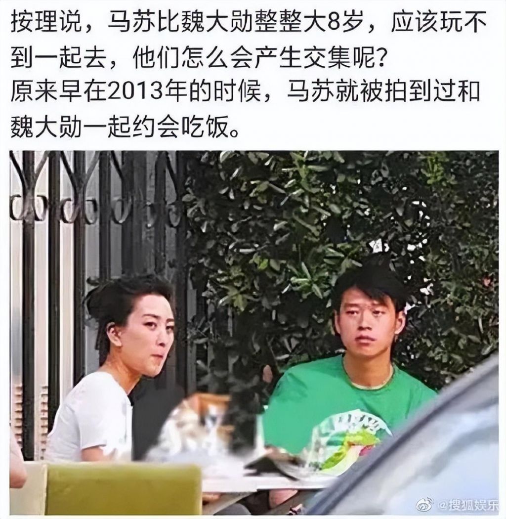 早在2013年,就有媒體拍到過馬蘇和魏大勳壹起約會吃飯的照片。當時魏大勳與馬蘇合作《今夜天使降臨》,不過馬蘇是女主,魏大勳則是小配角。
