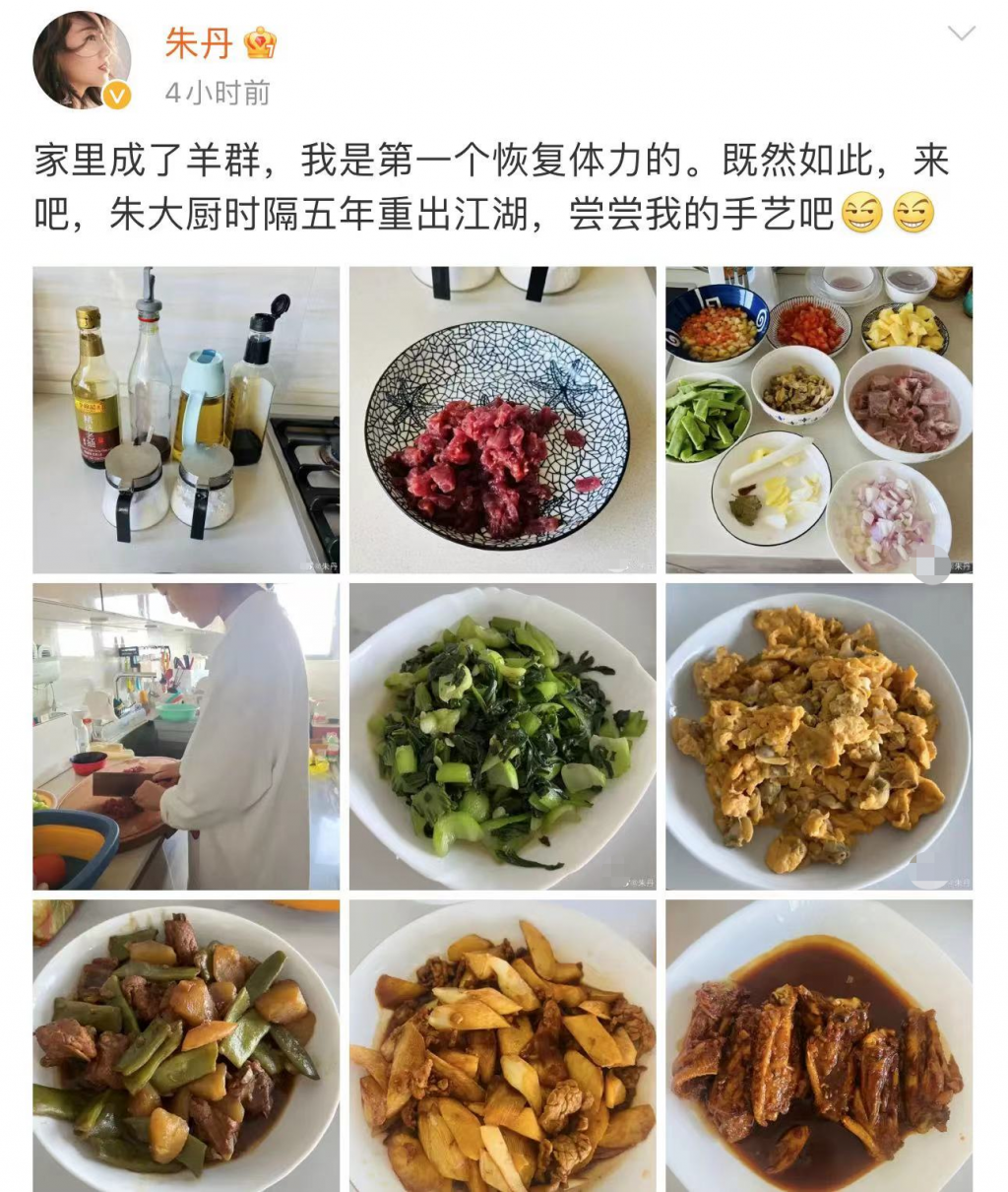 壹個多月沒有發文的朱丹,日前突然在社交賬號上曬照,並感慨地表示她的家裡成了“羊群”,作為家中第壹個恢復體力的人,她時隔伍年再次下廚,做美食照顧全家人。