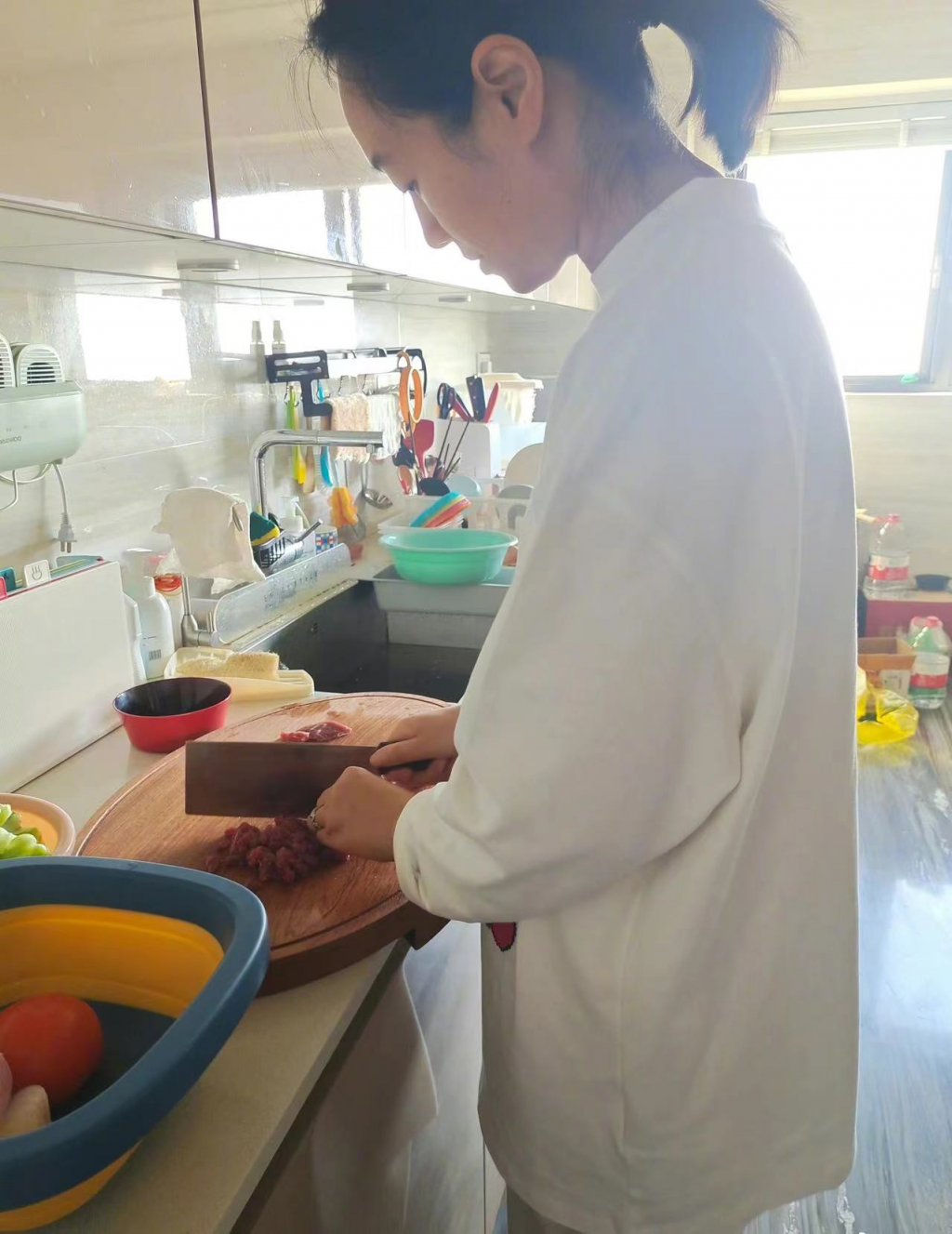 曝光的照片中,41歲的朱丹穿著寬松的居家服,素顏露面。拿著菜刀的她站在廚房裡,細心切肉,手上銀色的婚戒相當吸睛。