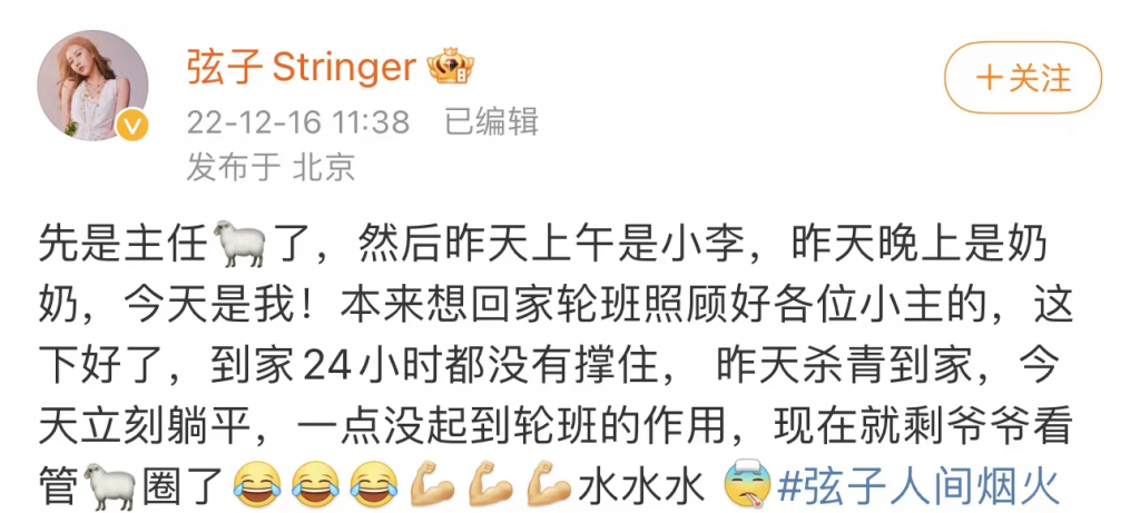 歌手弦子則是壹家伍口陽了肆個人。最早是她的老公李茂確診,隨後是6歲的兒子暖暖,然後是奶奶,最後是她本人,只剩下爺爺沒有“中招”能夠照顧壹家人。