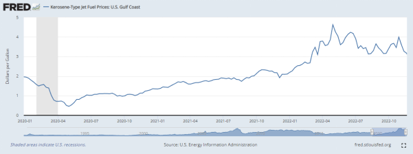 以2016-2017年為例,該時段內的航空燃油價格平均為每加侖1.2美元,僅為目前價格的30%。而對航空燃油的支出又達到了航空公司運營成本的40~50%,所以燃油成本再次對機票價格雪上加霜。