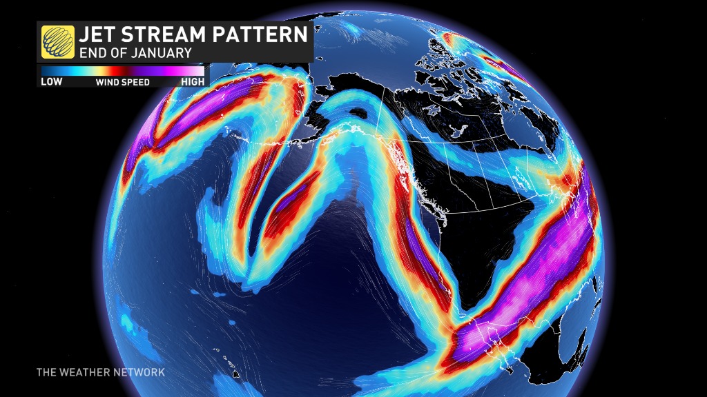 在1月份结束时,喷流正进入一个放大的模式,预示着一个更活跃的天气模式。一些天气模式表明,一块冷空气可以穿越极地,把冷空气带到加拿大的部分地区。