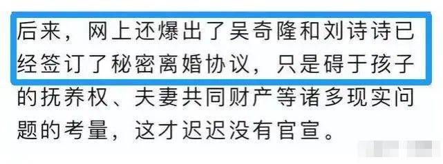 爆料還提到,吳奇隆和劉詩詩其實私下已經秘密簽了離婚協議,但是礙於兒子的撫養權、以及夫妻身上的代言,所以目前還不能對外公布。對於這種事情,其實在娛樂圈也算常見,不少明星夫婦會因為代言等問題先不公開離婚,等合約到期後再公開離婚。