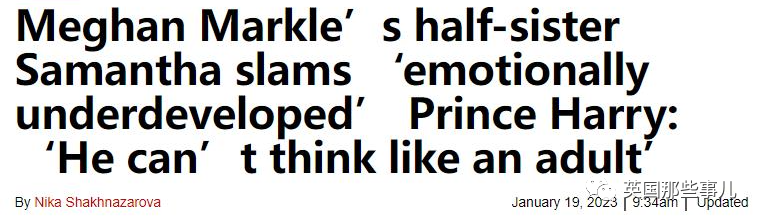 之後幾個月,薩曼莎開始各種上媒體噴梅根哈裡夫婦,比如今年《備胎》出版後,薩曼莎就說哈裡“情感沒發育完全”,“不能像成年人壹樣思考”等等........
