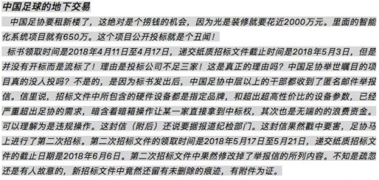 此外,文中还曝光了中国足协租用世东国际大厦的天价租金丑闻,以及相关装修工程的招标黑幕。