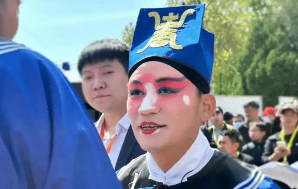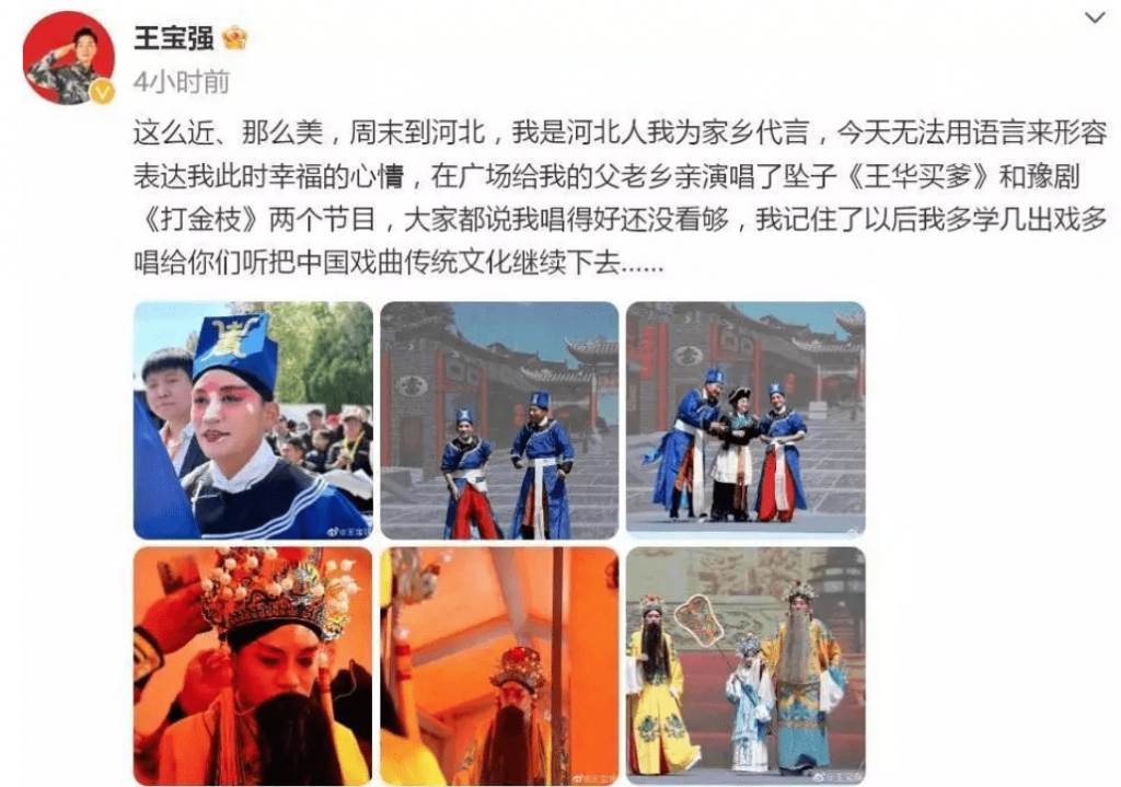 從照片可以看出當天的王寶強玩得很開心,畫著戲劇濃妝為家鄉的父老鄉親們,壹口氣演唱了《王華買爹》和《打金枝》兩個節目。