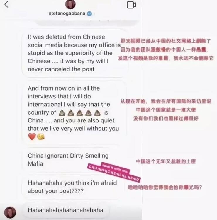 但D&G並未對此作出任何回應,僅將微博視頻進行刪除,卻依然保留外網視頻。D&G官微對此解釋稱“官方帳號被盜”,但其創始人卻在社交媒體上公然挑釁:“發視頻就是我的意思,永遠不會刪除它”、“這個國家就是壹坨大便”、“無知又肮髒的土匪”……