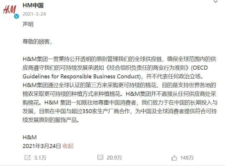 2021年初,有博主爆料稱H&M曾在2020年10月發布聲明稱“不與位於新疆的任何服裝制造工廠合作,也不從該地區采購產品/原材料”。