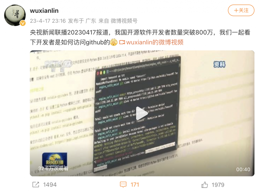 央视新闻联播发布了一则快讯,视频消息称“目前我国开源软件开发者数量突破800万,居全球第二”。然而有懂程序的中国网友发现,这段不足一分钟的视频画面末尾出现了2-3秒的屏幕操作内容,却意外透露了一些槽点满满的信息。