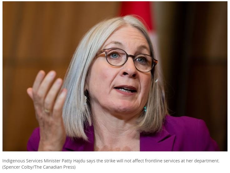 原住民服務部長(Minister of Indigenous Services of Canada)凱杜(Patty Hajdu)表示,她已經從壹些原住民首領那裡聽說,他們對聯邦部門在罷工期間的運作表示擔憂。聯邦政府為正式注冊的原住民提供許多壹線服務。
