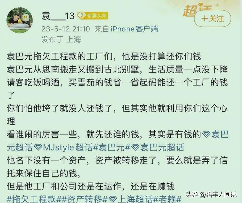 去年,袁巴元商業遭遇滑鐵盧,由其創建的服飾品牌公司破產,被執行金額高達兩億元,關於這些錢,袁巴元並沒有依法償還,由此便背負多條限高令,成為名副其實的老賴。