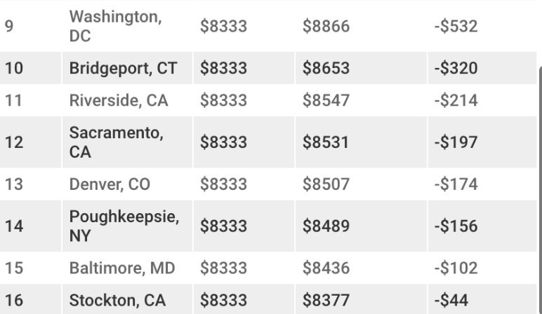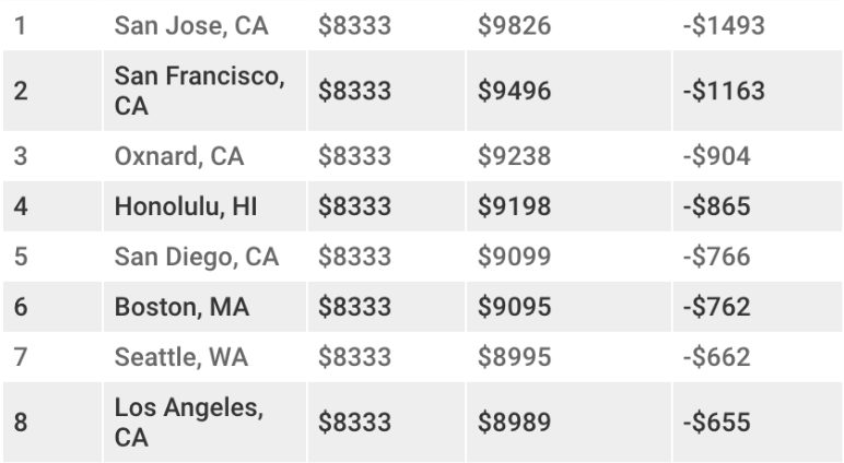 上限的差距更大,在克利夫蘭掙個71,124美元就算收入不錯,而爾灣得達到211,548美元。