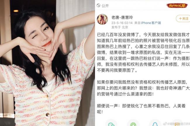 正當迪麗熱巴深陷生圖流出的窘境時,當時替她拍攝這組商業照的攝影師唐慧玲在凌晨出面闢謠,表示她沒有權利公開藝人未修圖的商業照,不知道這組照片從何而來,但強調這組照片非原圖,而是經過“銳化”,意即是有心人士刻意丑化迪麗熱巴,企圖散布她的丑照,唐慧玲也開嗆酸民說:而當時拍攝的攝影師唐慧玲在半夜出面闢謠,直言:“即使銳化了也黑不著熱巴,人美著呢!”許多粉絲也讚歎迪麗熱巴的天然美貌,即便被惡意P圖仍顏值在線。