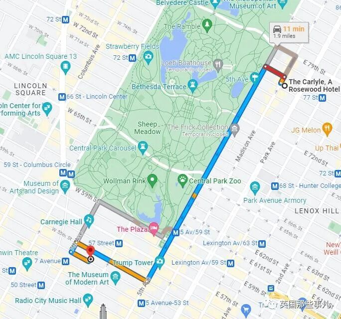 如果還是照常住酒店,“追車”大概率也就終止於Carlyle門口了,因為酒店不可能讓狗仔進去,Carlyle離頒獎禮的地方也不遠,就11分鍾車程......